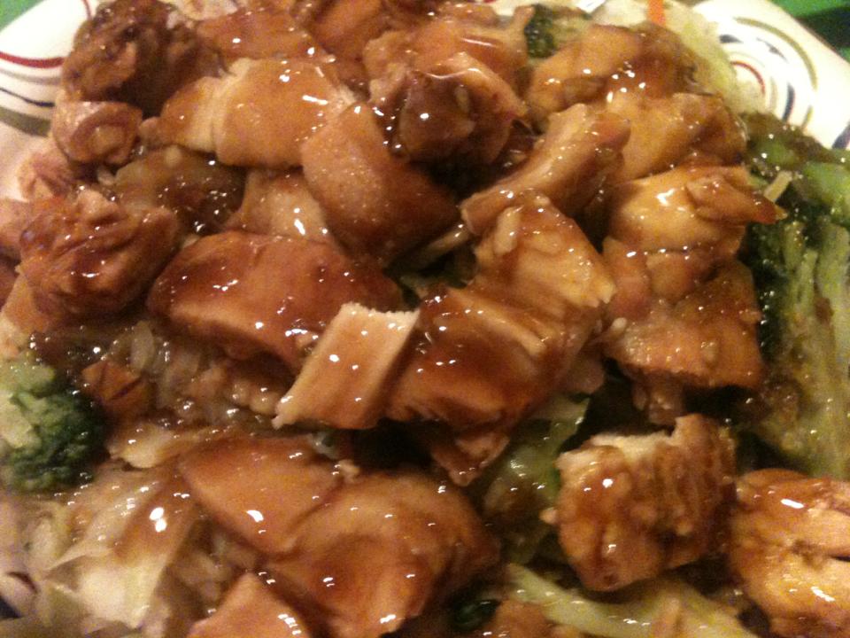 Add your vege's if desired, it's great without them too. Cut up your Chicken however you like. Pour on some Teriyaki sauce, garnish with sliced green onions and/or sesame seeds, if desired and Enjoy!